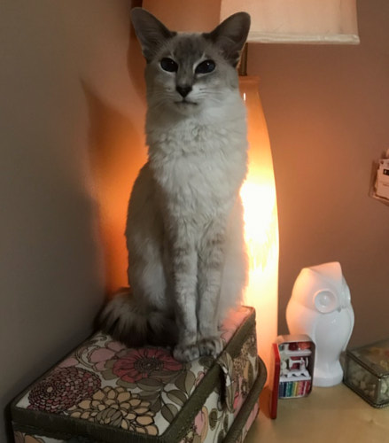 My oldest cat, Maya, will do anything for warmth. Her second name is Seat Thief – the moment you stand up, or even dare to lean a little off your chair reaching for something, she just appears there instantaneously. She magically transports to your lap without you even knowing until it is time to get up and you’ve discovered yourself catnapped. She’s a sly one. When not absorbing your body heat, one of her chosen spots in the house has always been on top of my sewing box, as it has a little bit of padding and is near enough a lamp that I suppose it is ever so slightly more warm than elsewhere in the house.