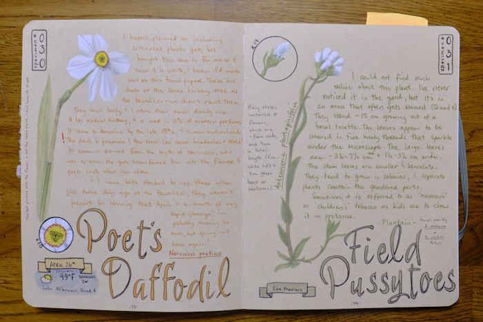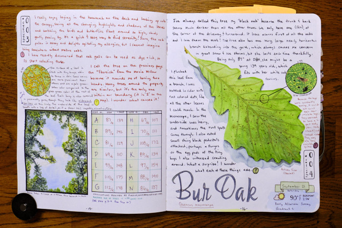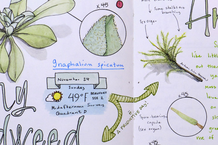 I also have always enjoyed scientific illustration. And, though I have not once enjoyed watercoloring, I do really appreciate the art form. So, one day after talking about how I’d like to properly learn scientific illustration and also learn to identify all the things in my yard, a friend at work tipped me off to John Muir Laws, a huge proponent of nature journaling. He describes it nicely: