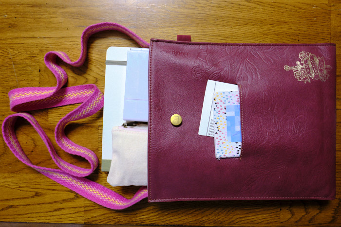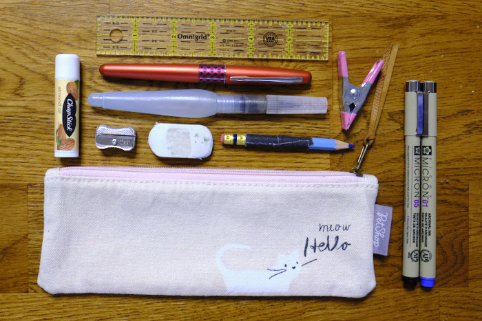 I began with black microns and colorful non-water-proof markers, and later switched to a fountain pen with permanent brown ink. I use to carry more in my kit but I’ve narrowed it down to very few items. I carry a small zipper pencil bag (brush, pen, and pencil of course, along with an eraser, sharpener, ruler, and clip for windy days), the palette, and the journal in a Bookaroo pouch that I sewed a shoulder strap to. I love it – sleek and lightweight. In its front pocket, I have a tiny notebook if I need to jot anything down, and some watercolors on a notecard. I also keep two microns on hand for the monthly summaries: a 05 black for most of the outlining, and a 01 blue for recording rain and snow. And a trusty chapstick, as I am fairly addicted. (I do miss Avon Care Deeply and am out hunting for a good replacement, if you know any!)