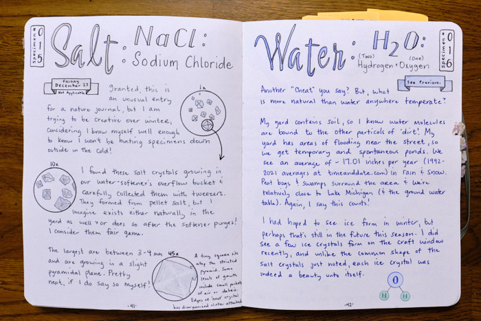 Being that I’m on volume three, having changed some things up yet a bit more, and realizing that the scientific illustration aspect, or at least the technical recording, is less attractive to me than the painting and neat bits of information I may learn, or the perception of touch and smell, well… needless to say there are over 100 specimens captured and over a year’s worth of monthly summaries, so rather than show everything in this post, I’ll simply point you to a new gallery I created for those interested titled 2026 Nature Journal v1 (I’ll get to the others later). I fuzzied out things that I’d rather keep off the interwebz, but you’ll get the gist regardless.