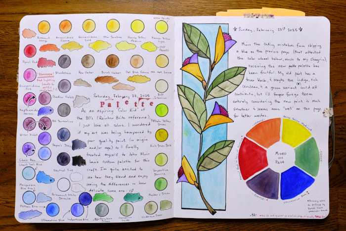 I did scoop up the blue pencil and waterbrushes John mentions a lot in his videos. Total. Game. Changers. No more smeared graphite, no more too-many-times-erased and rough paper. No more inconsistent wetness in paints. Once I realized I was into it, I splurged on John’s palette, too, and then I devoted a spread exploring those colors. This also shows that my book isn’t meant to be a finished piece of art – it is a place I explore and mistakes might bring frustration, but they don’t stop me from continuing on. I understand watercoloring more now, and rarely use the wicking of the waterbrush anymore, but I couldn’t have gotten here without being able to control that variable in the beginning. I also learned that I am a hot-press paper kind of girl (rather than the bumpy cold press). And I paint “dry” rather than those lovely washes of wet color that I admire so much. (I’m doubtful that style will ever be in my future, but never say never.)