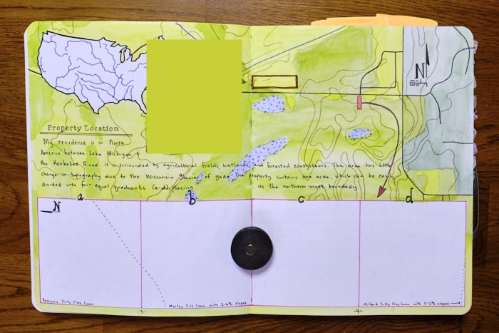 The first volume includes a topographic map that I’ve fuzzied out for privacy but you can see it begins with the nation and zeros in to my plot of land. This page is unfinished currently (big blank rectangle at the bottom), as I intend to include a map of our yard but haven’t yet done so. I know, this was years ago now, but that’s the beauty of taking things slow and as they come, what can I say?